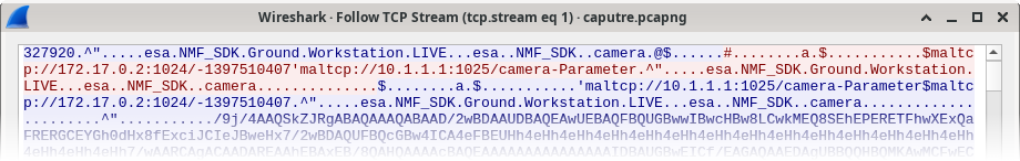 I then used the Consumer Test Tool to connect to maltcp://10.1.1.1:1024/nanosat-mo-supervisor-Directory, I noticed the camera app and started it. I then connected to maltcp://10.1.1.1:1025/camera-Directory. This exposed the action service Base64SnapImage to get a photo along with two parameter services: NumberOfSnapsTaken and Base64SnapImage to get the base64 encoded content of the image. After submitting the action Base64SnapImage, I noticed that NumberOfSnapsTaken increased and Base64SnapImage had some content. Due to the challenging interface of the CTT, I captured the traffic with Wireshark on the host and extracted the Base64 encoded payload: