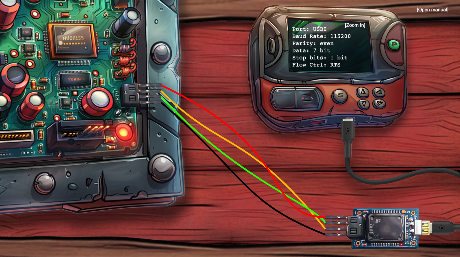 Having the information, we can wire up the UART bridge (remember to invert TX & RX), set the parameters and connect: