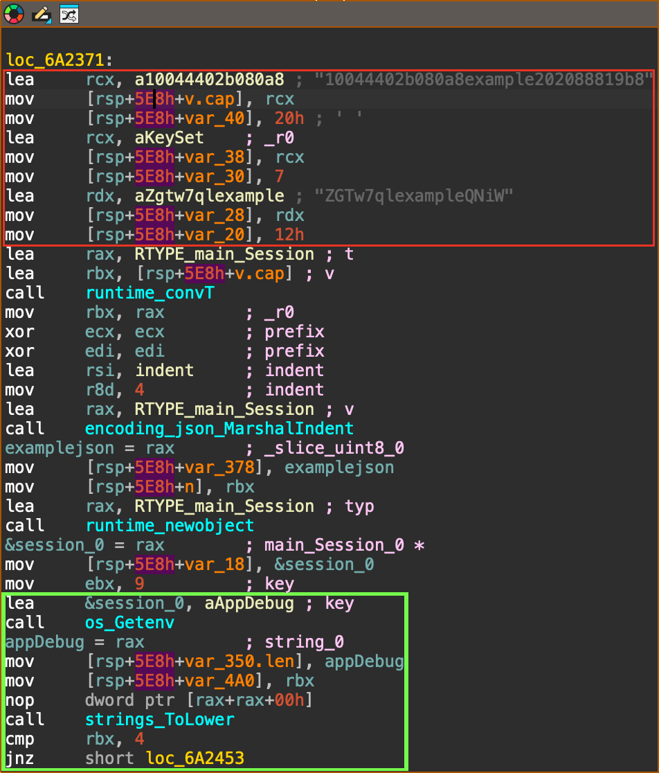 When started, the executable sets up the example values for digest and status (red box) and searches for the presence of the APP_DEBUG environment variable (green box):