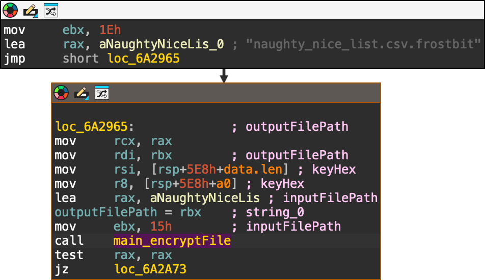 If this file is found it will then go ahead, create the naughty_nice_list.csv.frostbit seen in the artifacts and encrypt the original file using the encryptFile function: