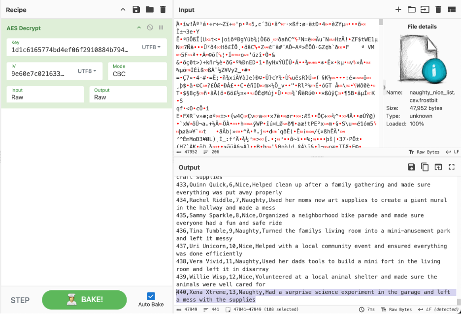 Knowing that the executable encrypts the file with AES-CBC and having obtained the encryption key, we can finally decrypt the naughty nice list: